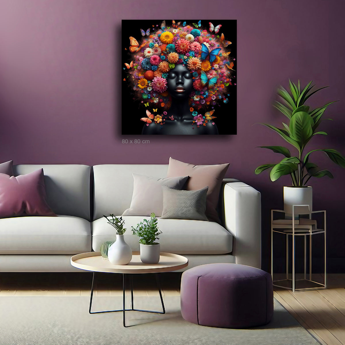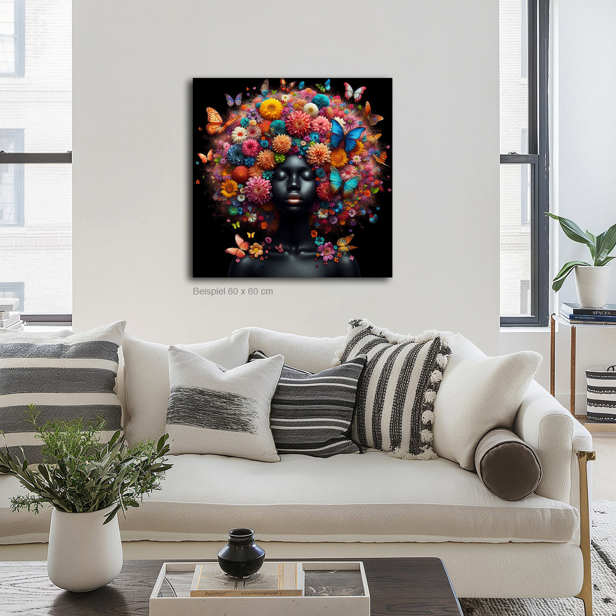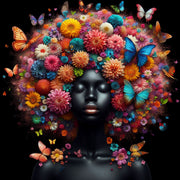 Afro Bloom ist pure Explosion von Farbe, Leben und Symbolik. Das Gesicht einer dunkelhäutigen Frau – glänzend, ruhig, kraftvoll – umrahmt von einem spektakulären Afro aus unzähligen Blumen und flatternden Schmetterlingen. Die Augen geschlossen, der Ausdruck friedlich – als würde sie eins mit der Natur träumen.