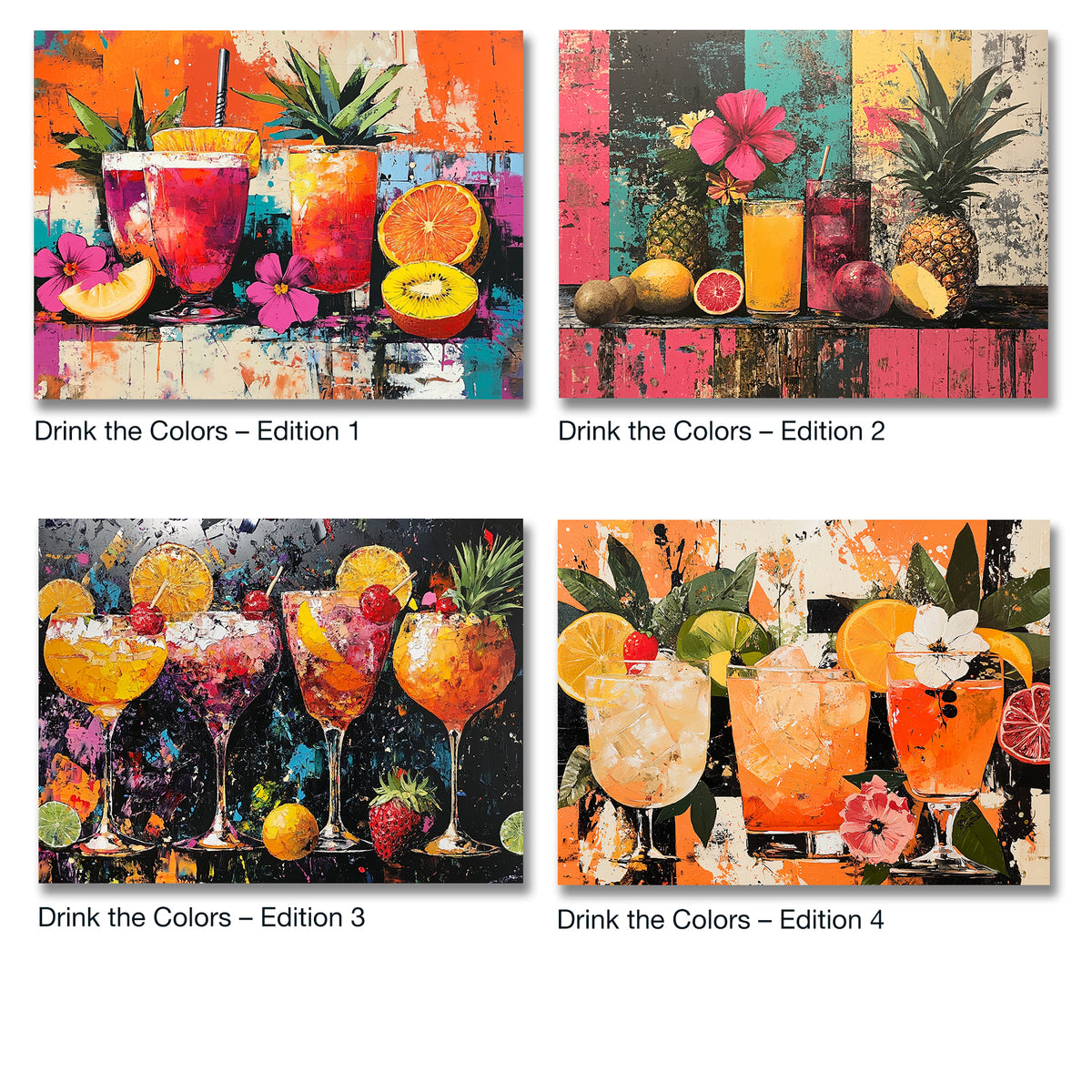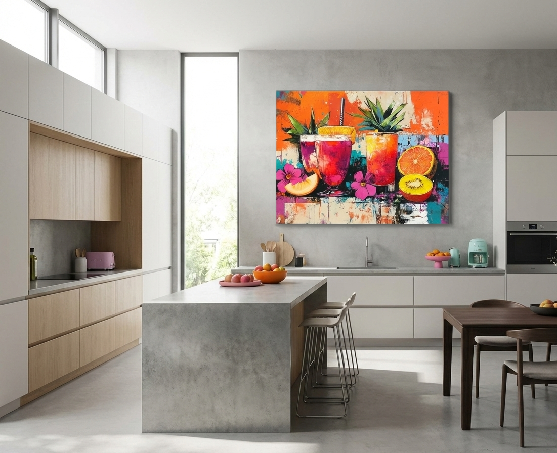 Leuchtende Cocktails vor einer urbanen Pop-Art-Textur aus Orange, Pink und Türkis. Tropische Früchte, Blüten und grobe Farbflächen verschmelzen zu einem modernen Stillleben mit starker Farbwirkung. Frisch, laut und stilvoll – ein klares Statement für zeitgemäße Räume. Das Bild wirkt gleichzeitig frisch, laut und stilvoll – wie ein visueller Kurzurlaub in Farbe. Ideal für moderne Wohnräume, Bars, Küchen oder Lounges