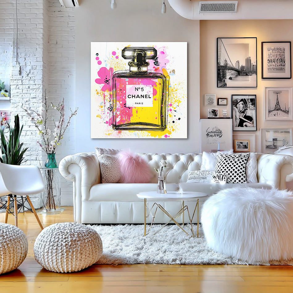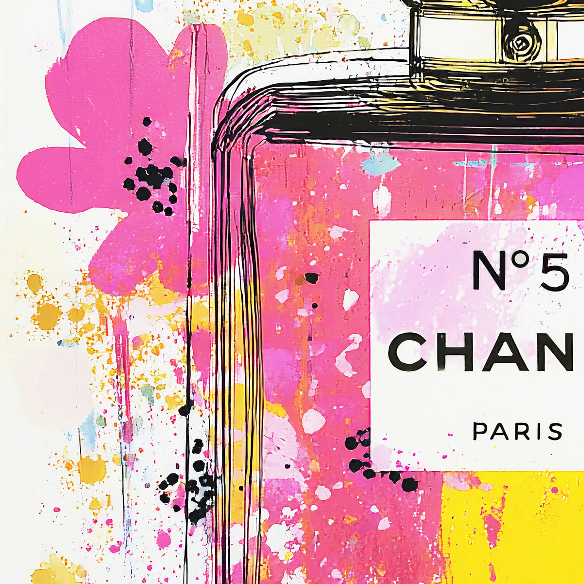 Ein Parfumflakon trifft auf Farbspritzer in Pink und Gelb – urban, wild, modern. „Eau de Pop“ ist eine Ode an Duft und Design, eingefangen in poppiger Illustration – ein modernes Kunstwerk voller Farbe und Duft-Assoziationen.
