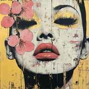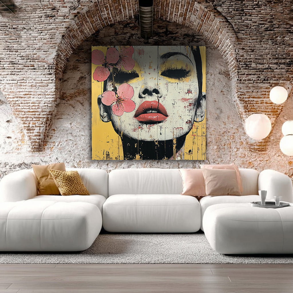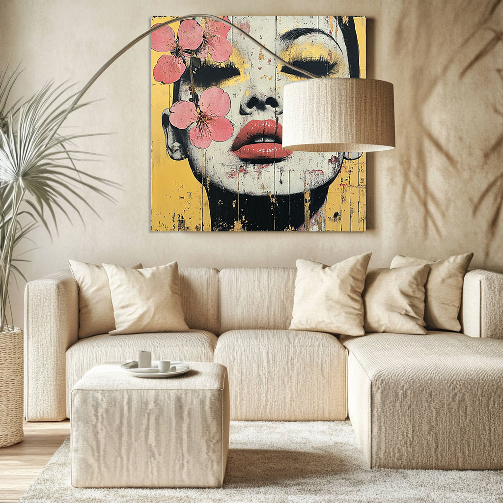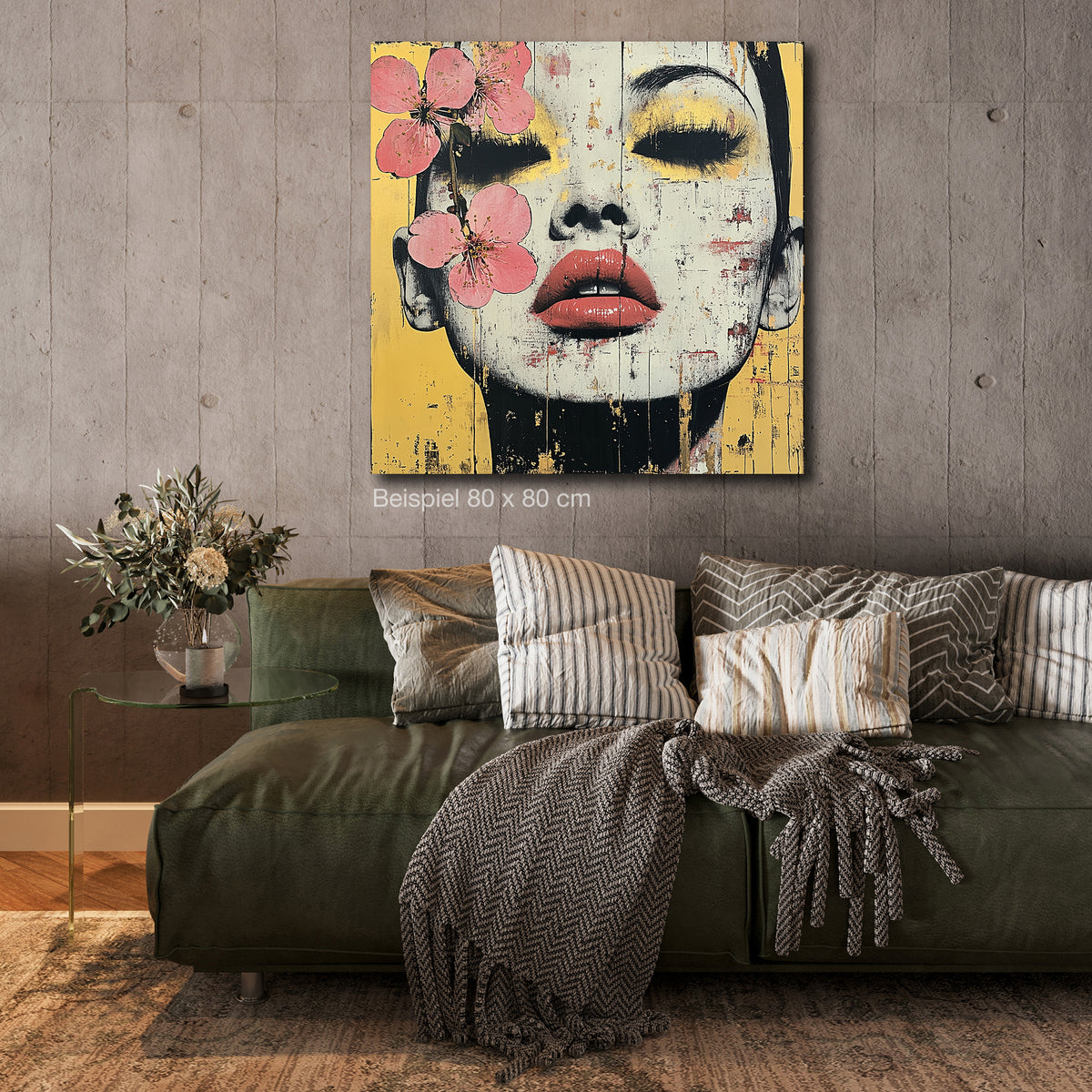 Golden Bloom vereint asiatische Anmut mit Pop Art-Attitüde. Ein weibliches Gesicht mit geschlossenen Augen, lasziv und ruhig – halb verdeckt von leuchtend pinken Kirschblüten. Um die Augen: goldene Applikationen, fast wie Maske oder Schmuck.