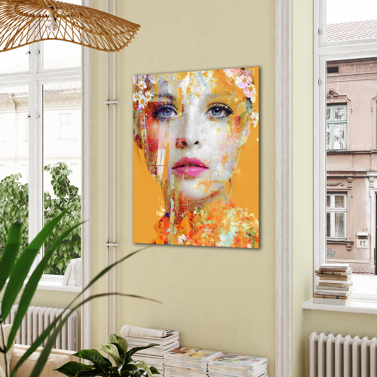 Ein modernes Pop-Art-Portrait im floralen Stil. „Orange Blossom“ kombiniert kräftige Orangetöne mit zarten Blüten und erzeugt so ein strahlendes, lebendiges Wandbild. Perfekt als Eyecatcher für Wohnzimmer, Atelier oder Büro – Kunst mit Farbe, Energie und femininer Eleganz.