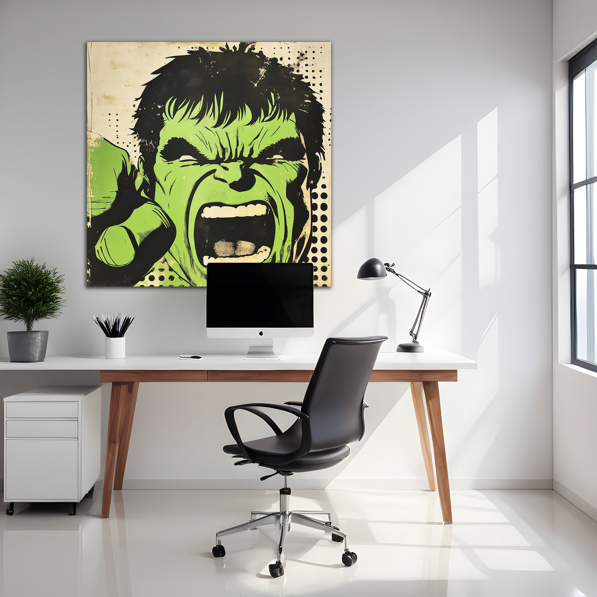Green Angry ist rohe Kraft im Retro-Pop-Art-Gewand. Ein grün verzerrtes Gesicht, pure Wut im Ausdruck, die Faust im Vordergrund – und das alles im klassischen Comic-Stil mit dicken Linien, Rasterpunkten und abgewetztem Druck-Look.