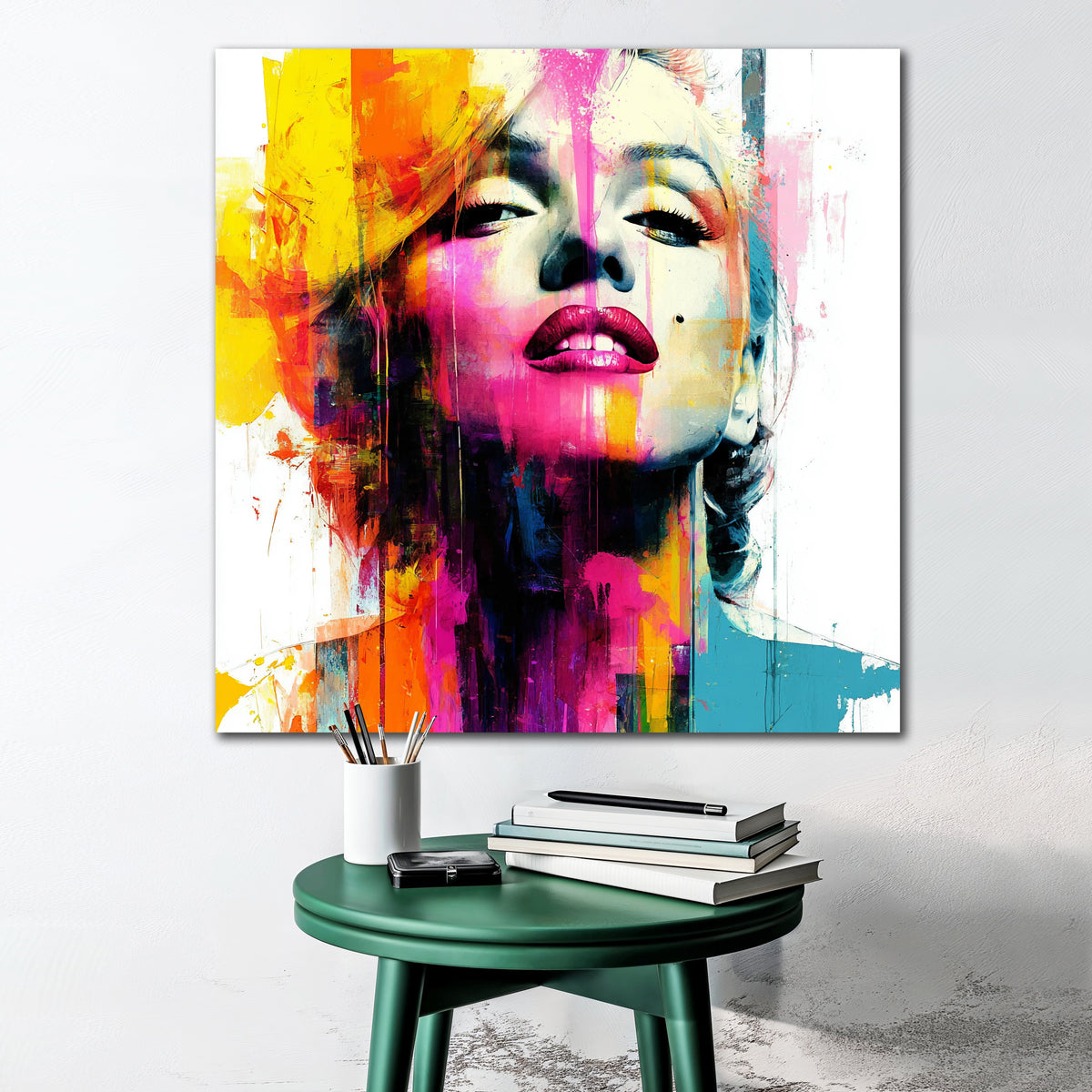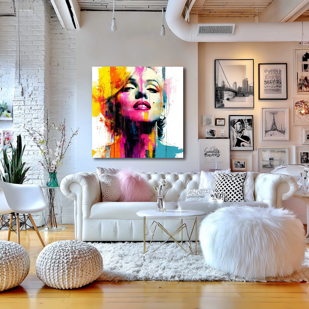 Eine Legende, neu gedacht. Dieses Werk bringt die zeitlose Ausstrahlung von Marilyn ins Hier und Jetzt – nicht als nostalgische Erinnerung, sondern als greller, wilder Farben-Clash. Pink, Gelb, Blau und Orange brechen über die Leinwand, überlagern das ikonische Gesicht und verwandeln es in ein modernes Statement. Glamour trifft Rebellion, Eleganz prallt auf Chaos – ein Bild, das nicht einfach nur hängt, sondern den Raum dominiert.
