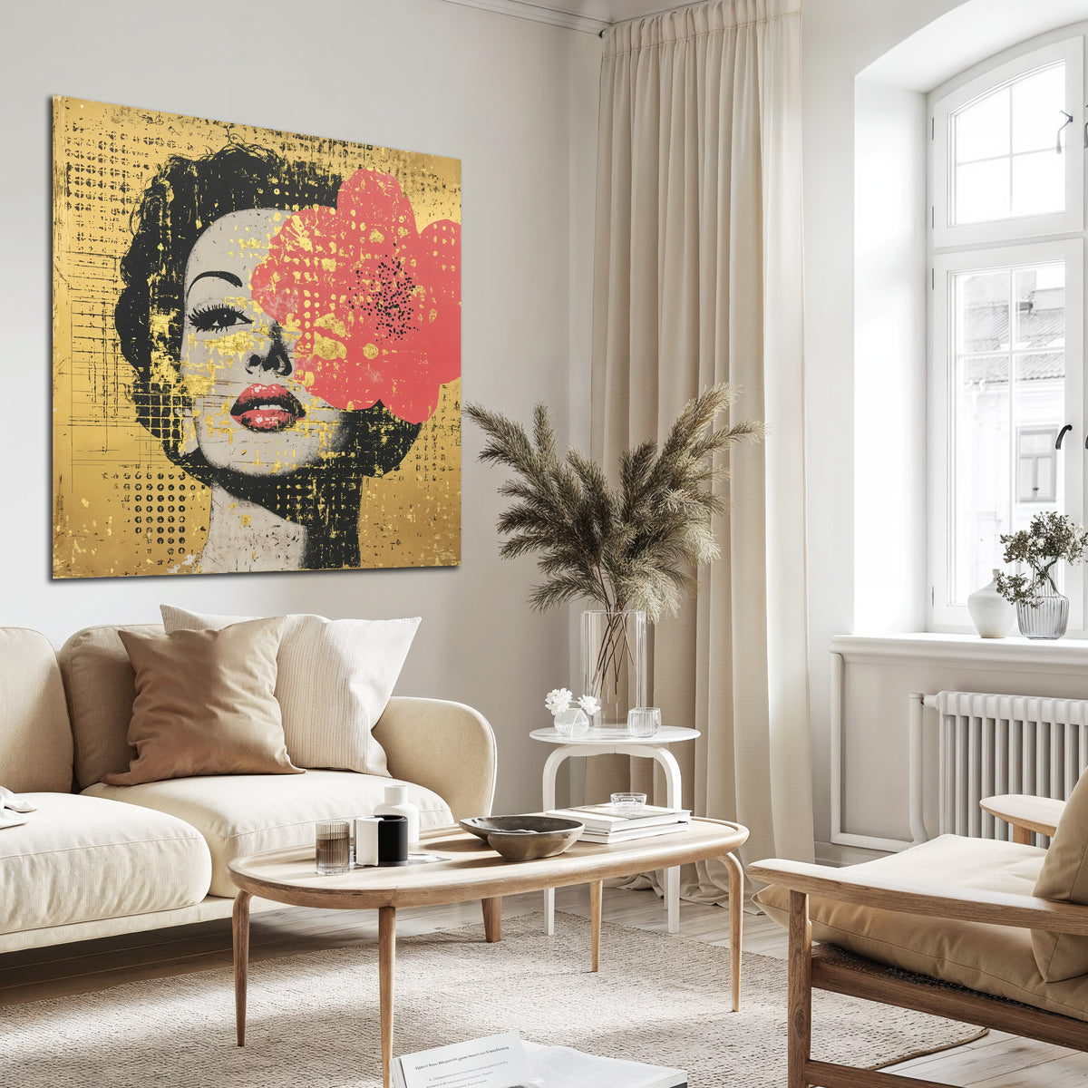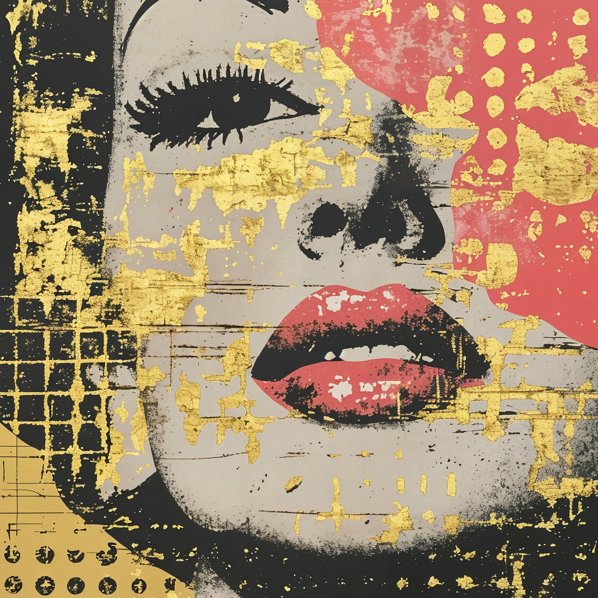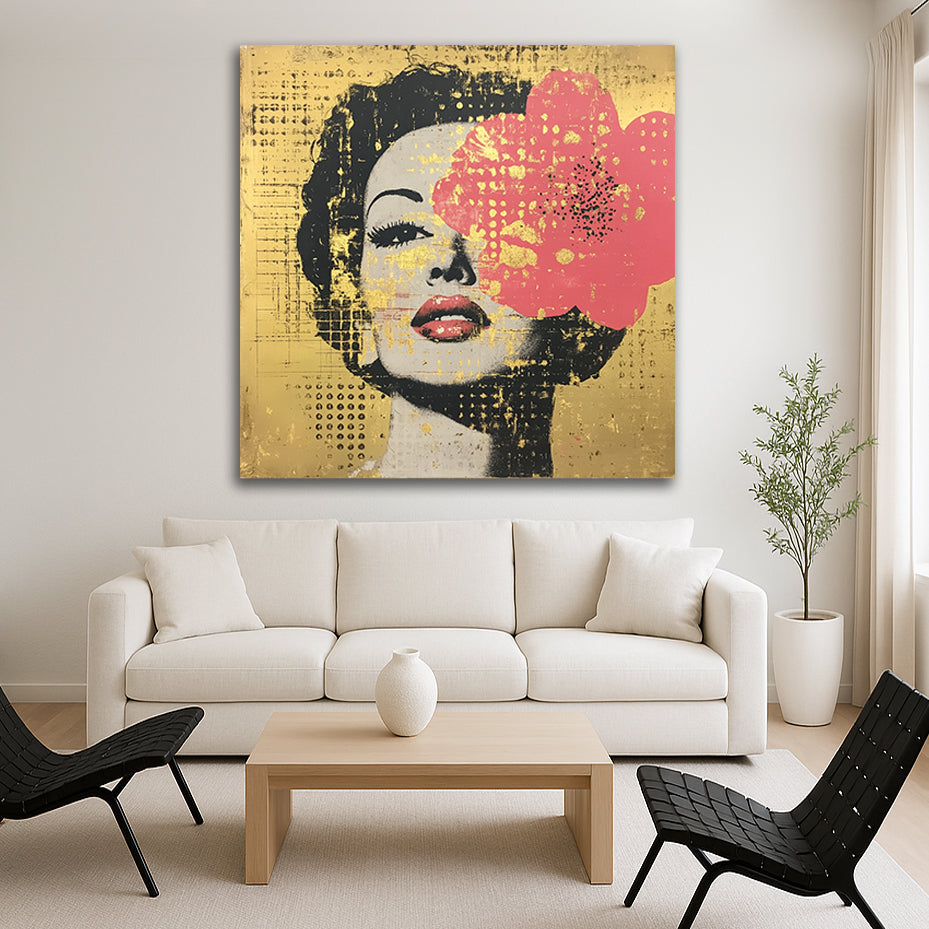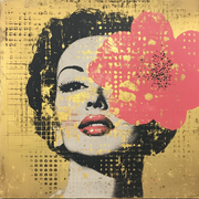 Glamour, Rebellion und Eleganz in einem Bild. Das Gesicht einer geheimnisvollen Diva erscheint vor goldenem Hintergrund – halb verdeckt von einer leuchtenden Lotusblüte in kräftigem Pink. Pop-Art trifft auf asiatische Symbolik und verleiht dem Werk eine faszinierende Mischung aus Stärke und Anmut. Goldene Strukturen, rauer Siebdruck-Charakter und die kühne Farbwahl machen Golden Lotus zu einem modernen Statement-Piece, das Räume mit urbaner Coolness und luxuriöser Ausstrahlung füllt.