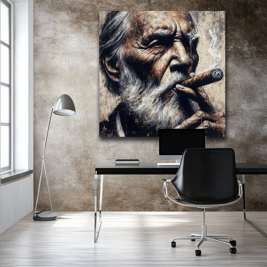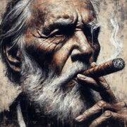 Die Zigarre glüht leise, der Rauch steigt langsam auf. Der Blick ist wach, nicht müde. Hier sieht man nicht Verfall, sondern Würde. Ein Bild von Charakter, von Lebenserfahrung, von jemandem, der nichts mehr beweisen muss.